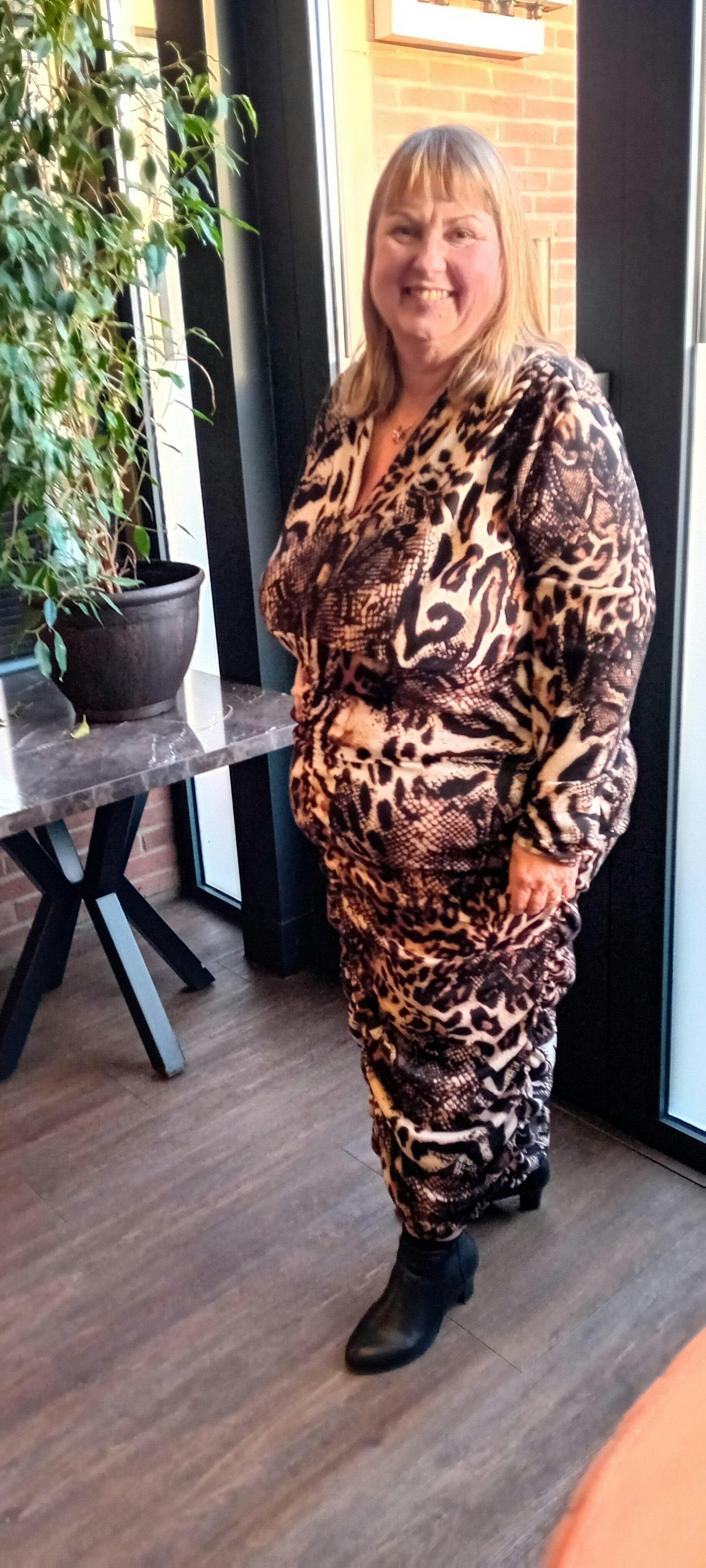 The Regal Rouge Dress Mixi Animal is modelled by our Queenie Claire who is 5’5 inches tall and is a size 20.